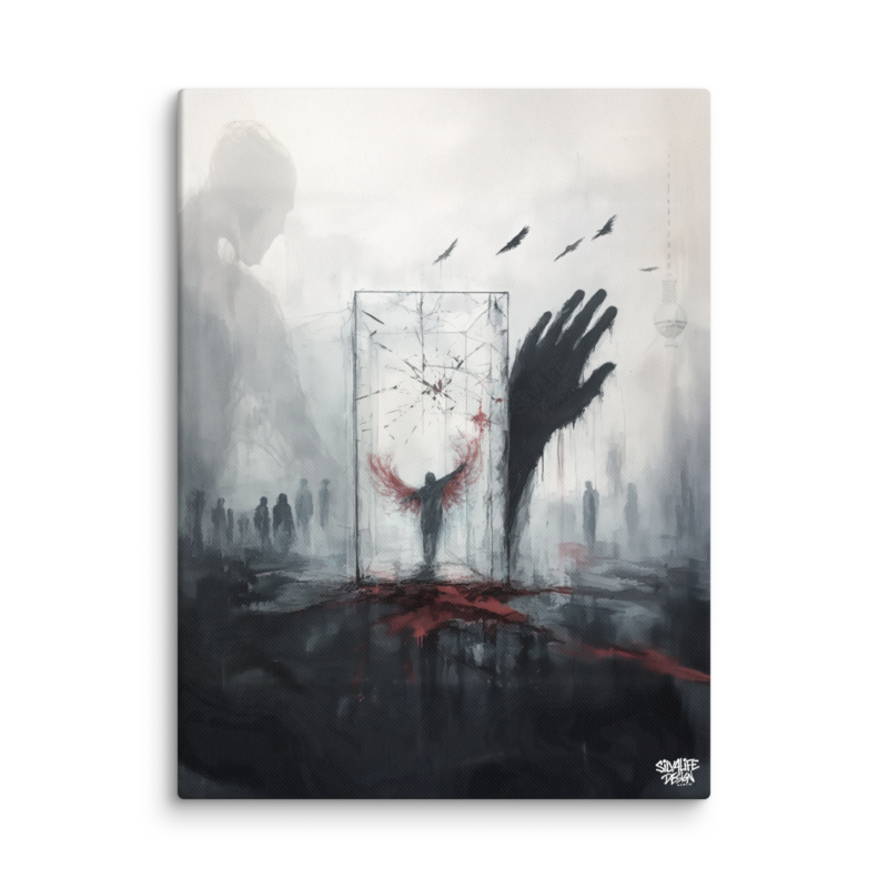 Das Motiv erzählt eine Geschichte, die viele fühlen, aber nicht aussprechen. Sie ist ein Spiegel der modernen Gesellschaft – ein Glashaus voller Risse, in dem wir alle stehen. Ein Kunstwerk für alle, die den Bruch sehen und nicht länger wegschauen.