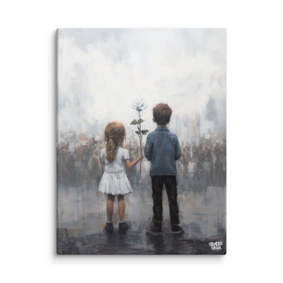 Zwei Kinder, eine weiße Rose und eine ungewisse Zukunft. Sie stehen gemeinsam vor einer unscharfen Menschenmenge, während der Nebel der Unklarheit die Szene einhüllt. Hoffnung oder Bedrohung? Unschuld oder Widerstand? Diese Leinwand fängt einen Moment ein, der keine einfachen Antworten gibt – sondern Fragen stellt.